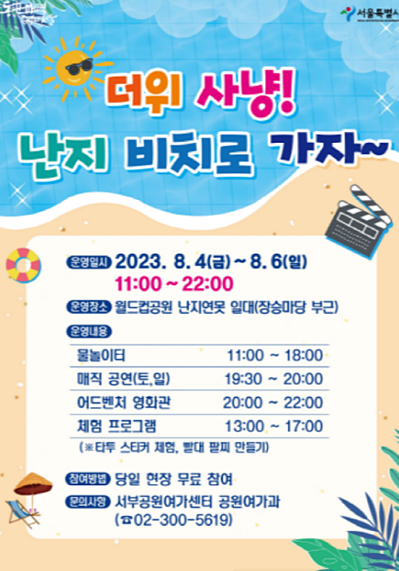 난지비치 개장 후 첫 여름 물놀이 행사 <더위사냥! 난지비치로 가자~>를 8월 4~6일, 11:00~22:00까지 3일간 무료로 운영한다. 바닥분수와 미니풀장, 어린이 미끄럼틀을 만나볼 수 있으며 물풍선 옮기기, 종이배 대회 등 6종 물운동회가 진행될 예정이다. 환경팔찌 만들기 등 재미있는 가족단위 체험프로그램도 준비되어 있다(11:00~18:00).