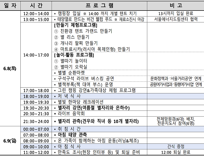 2017년부터 시작된 제6회 서울별빛캠핑은 6월 환경의 달을 맞이하여 <텐트 밖은 지구, 별>을 주제로 온 가족이 다 함께 별을 관측하고 지구를 위한 친환경 캠핑과 자원순환까지 실천해보는 행사이다.