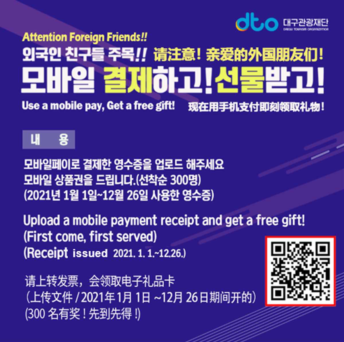 위드코로나 시대를 준비하며 대구를 방문하는 외국인이 좀 더 안전하고 손쉽게 쇼핑을 즐길 수 있도록 준비된 이번 이벤트는 12월 13일부터 26일까지 진행되며, 모바일페이를 이용해 결제한 영수증만 인증하면 상품권을 획득할 수 있는 기회를 얻을 수 있다.