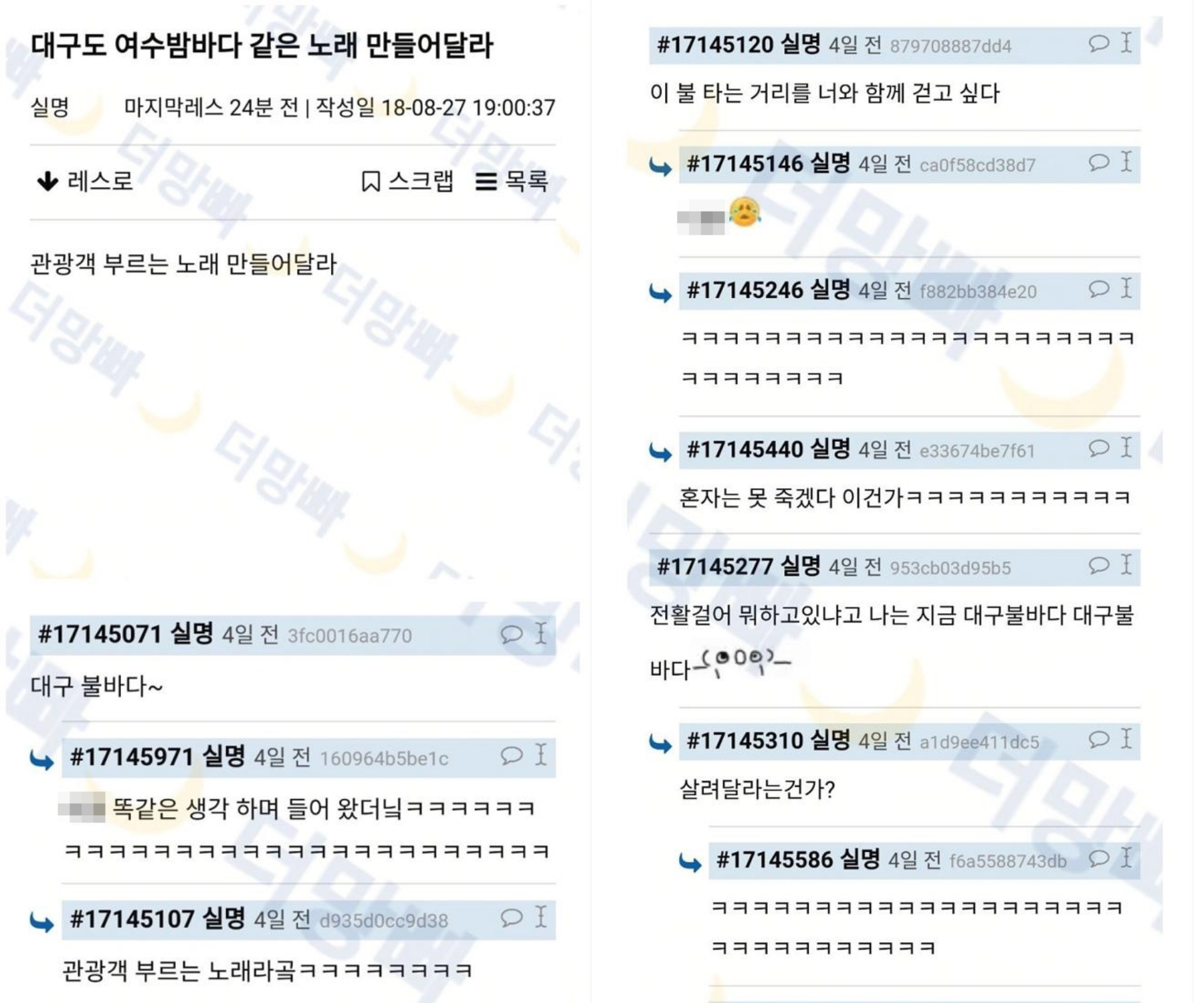 언제나 그렇듯 게시자의 의도와는 달리 드립들이 난무하며 완전히 다른 곡이 하나 만들어지게 된다. 감미로운 제목과 가사 대신 대구의 폭염을 재미있게 빗댄 제목과 가사가 만들어졌다.
