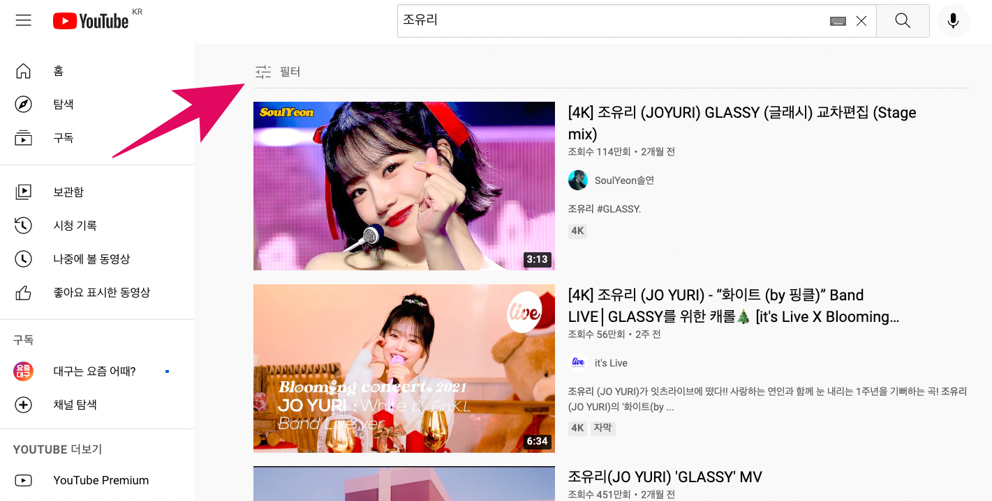 유튜브 검색창에서 '키워드'를 넣어 검색하면 아래와 같은 화면이 보인다. 여기서 검색창 바로 아래에 작은 '필터' 버튼을 확인할 수 있다.