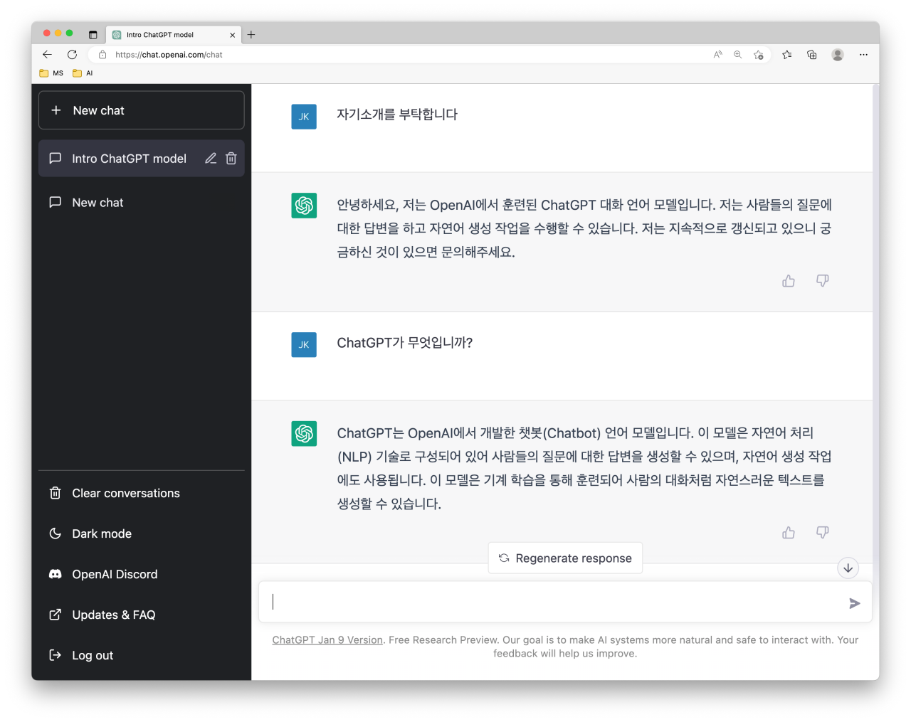 ChatGPT는 대화형 인공지능(AI)으로 화면 하단에 있는 프롬프트 창을 통해 질문을 입력하면 자동으로 답변을 달아준다. 먼저 자기소개를 부탁했다.