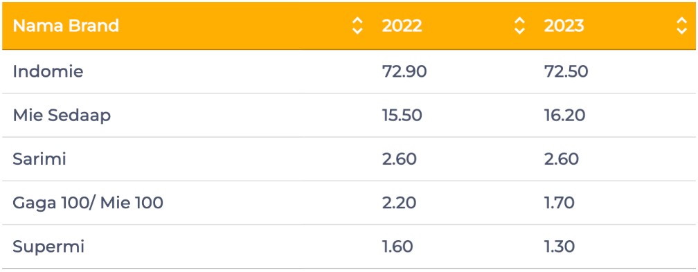1위는 인도미(Indomie)가 차지했다. 72.5%의 선택을 받은 인도미는 수년 동안 인도네시아 사람들이 가장 좋아하는 인스턴트 라면으로 꾸준히 자리를 지켜왔다. 1972년 닭고기 국물맛으로 처음 출시되었으며 1983년에는 볶음면(미고렝)으로 출시되기도 했다. 인도미는 인도네시아 뿐 아니라 미국, 호주, 대만, 사우디아라비아 등 세계 각국에 수출되며 글로벌 시장 점유율 1위를 차지하고 있다.