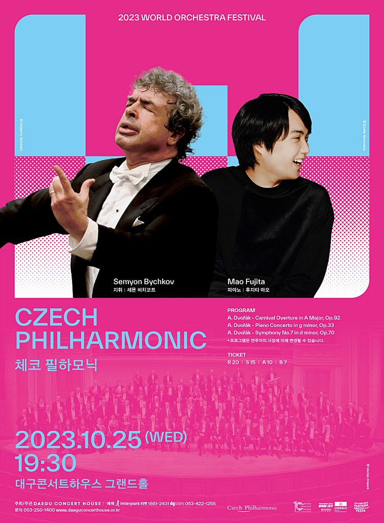주요한 레퍼토리에 대한 명확한 해석으로 정평이 난 ‘세묜 비치코프’와 일본의 조성진이라는 별명을 가진 ‘후지타 마오’가 해석한 드보르자크의 곡들을 10월 25일 오후 7시 30분 대구콘서트하우스 그랜드홀에서 감상할 수 있다. 드보르자크, 말러 등 체코 출신 유명 작곡가들의 레퍼토리를 가장 잘 연주한다고 평가받는 체코 필하모닉은 드보르자크의 사육제 서곡 A장조, Op.92와 교향곡 No.7 d단조, Op.70을 들려줄 것이다. 더불어 후지타 마오와는 드보르자크의 피아노 협주곡 g단조, Op.33을 연주할 예정이다.