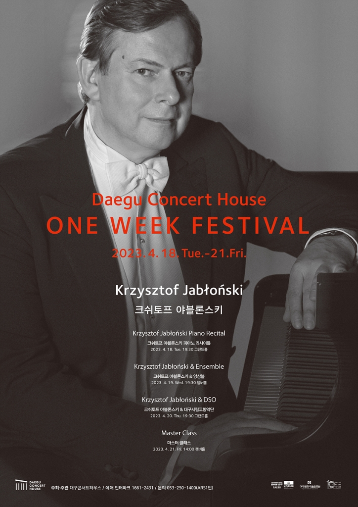 피아니스트 크쉬토프 야블론스키와 함께 하는 ‘원 위크 페스티벌’은 피아노 리사이틀, 앙상블, 오케스트라 공연뿐만 아니라 지역 음악대학 학생과 청년 음악인을 위한 마스터클래스가 준비돼 있다. 이 모든 것이 일주일 동안, 바로 대한민국 대표 클래식 전용홀 대구콘서트하우스에서 펼쳐진다. 한 연주자가 이 모든 것이 가능하다는 것이 믿기 어렵지만 야블론스키는 그것을 가능케 한다.