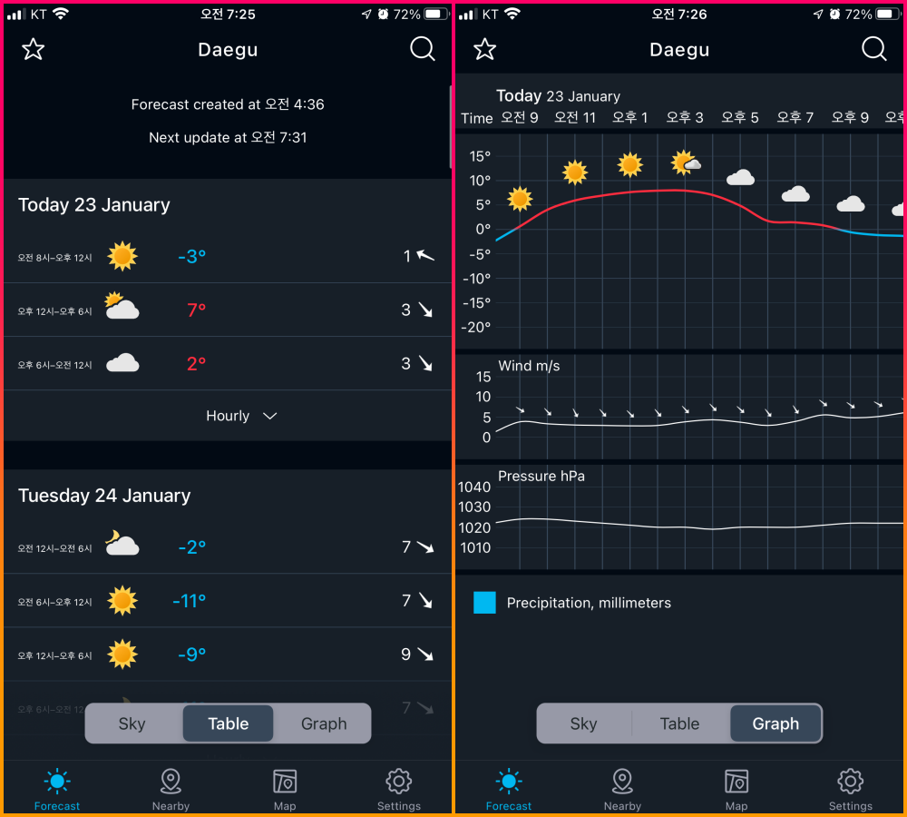 테이블을 살짝 아래로 드래그하면 현재 일기예보를 기준으로 한 시각와 다음 예보 시각도 확인 할 수 있다. 'Graph' 화면에서는 시간별 기온과 풍속, 기압, 강수량을 그래프 형태로 확인할 수 있다.