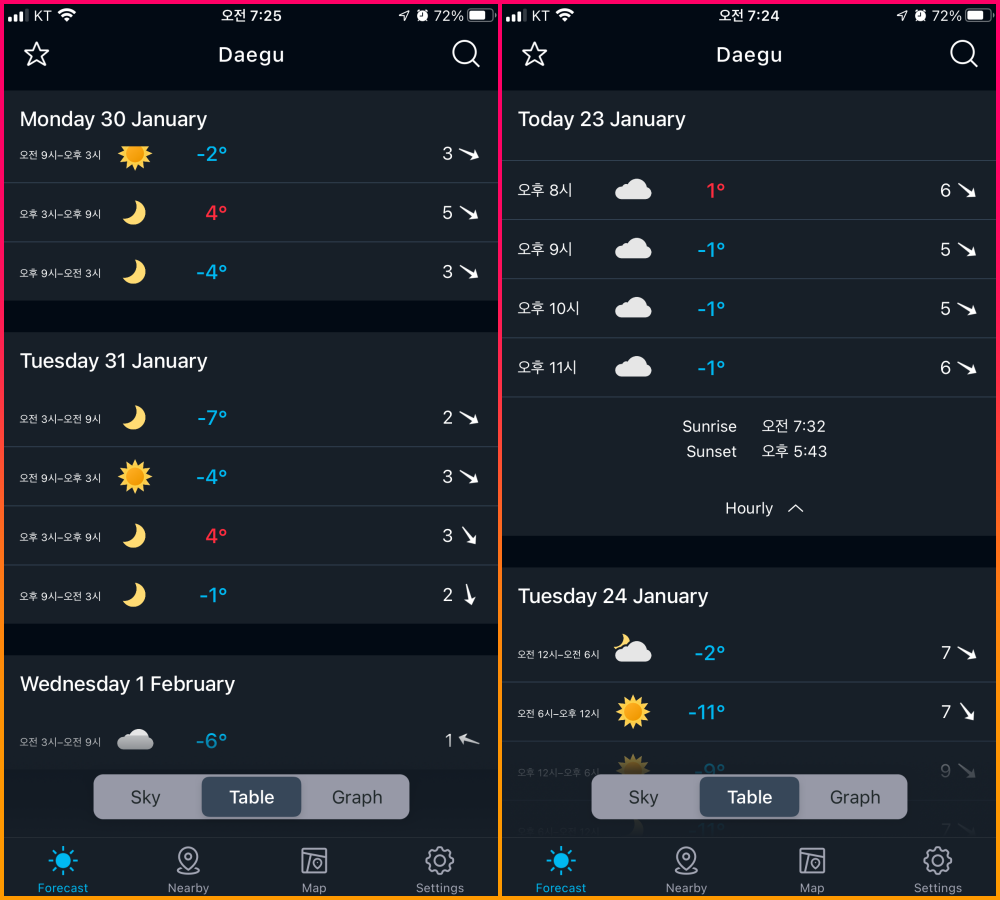 'Sky' 화면에서는 현재 시각과 현재 기온, 풍향, 풍속, 강수량 그리고 일출 시간을 확인 할 수 있다. 'Table'을 선택하면 오늘과 내일 등 앞으로의 일기예보가 테이블 형태로 표시된다. 일자와 시간별 날씨 확인이 가능한데 기상 상태와 기온, 풍향, 풍속을 확인 할 수 있다. 또한 일출과 일몰시간도 확인이 가능하다.