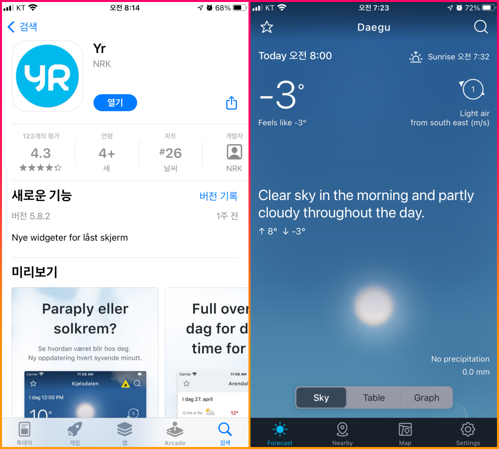 'Yr'을 설치하면 현재 자신이 위치해 있는 지역의 날씨를 바로 확인할 수 있다. 또는 지역을 선택해 해당 지역의 날씨를 확인 할 수도 있다. 예보(Forecast) 탭에는 3가지 메뉴가 있는데, 날씨 정보를 한눈에 살펴볼 수 있는 'Sky', 일자별 날씨 정보를 확인 할 수 있는 'Table', 마지막으로 기온 변화를 그래프로 확인 할 수 있는 'Graph'가 있다.