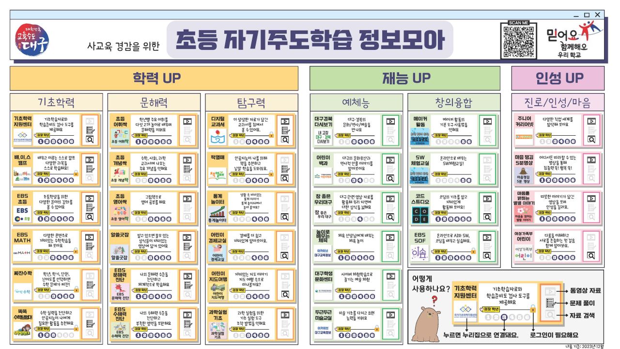 대구시교육청은 이번에 개발한 ‘자기주도학습 정보모아 온라인 리플릿’을 관내 초등학교 누리집에 탑재해 초등학생 및 초등 학부모 누구나 활용할 수 있도록 했다.