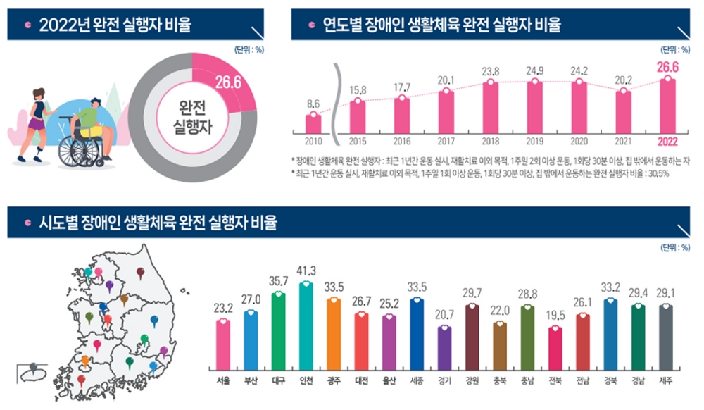 전국 등록장애인 1만 명(만10세~69세)을 대상으로 실시한 본 조사에서 실질적인 생활체육 참여 지표인 장애인 생활체육 완전 실행자가 35.7%로 전국 평균 26.6%를 크게 상회하였을 뿐만 아니라, 2021년 대비 4.5% 증가하며 현저한 상승세를 보였다.