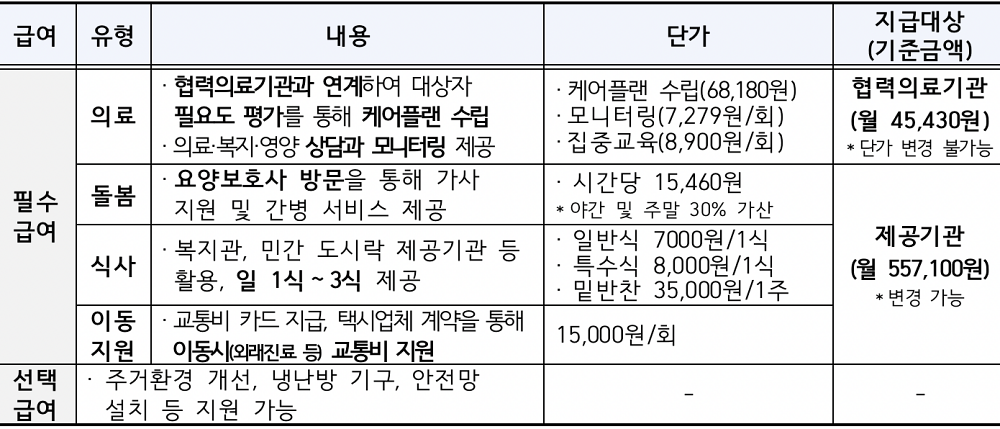 재가 의료급여 대상이 되는 수급권자는 의료급여관리사, 협력의료기관 케어팀(담당의사, 간호사, 사회복지사, 영양사 등으로 구성)과의 의료·복지 필요도에 기반한 케어플랜을 바탕으로 최대 2년간 의료, 돌봄, 식사, 이동 지원 등의 서비스를 받게 된다.