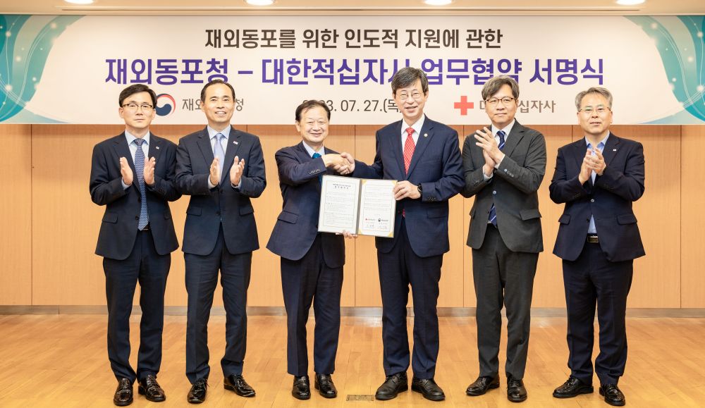 이기철 재외동포청장과 신희영 대한적십자사회장은 7.27.(목) 「재외동포에 대한 인도적 지원에 관한 업무협약서」에 서명하였다.