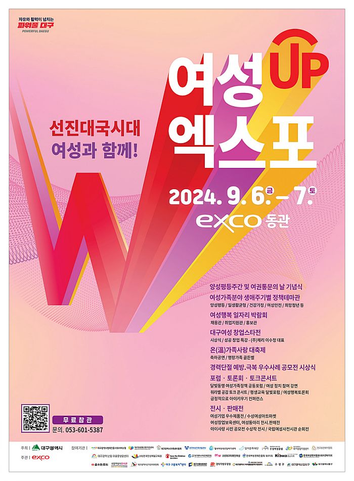 대구광역시는 양성평등주간(9.1.~9.7.)을 맞아 전국 유일 여성가족분야 종합박람회인 ‘2024 여성UP엑스포’를 9월 6일(금), 7일(토) 양일간, 대구 엑스코 동관(전시 5~6홀)에서 개최한다.