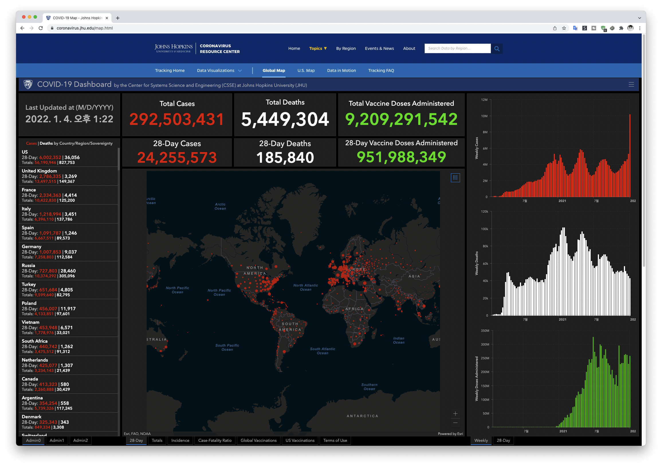 먼저 소개할 곳은 미국 존스홉킨스대학 코로나바이러스 리서치센터에서 운영하는 COVID-19 맵으로 전세계의 코로나 바이러스 현황을 한눈에 살펴볼 수 있다. 현시각 총 확진자수와 사망자수, 백신 투여 횟수를 확인 할 수 있다.