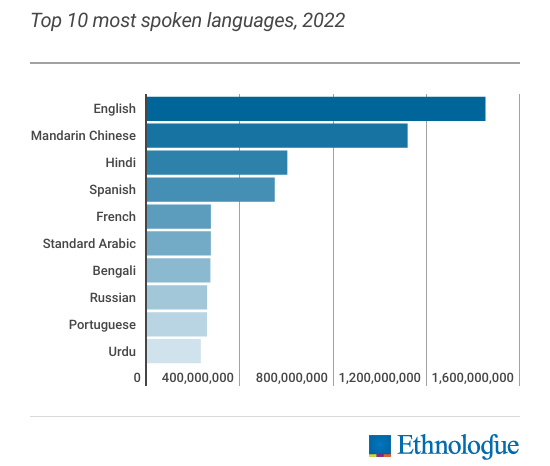 2위는 중국어(Mandarin Chinese)로 11억명이 사용하고 있다. 중국과 대만, 싱가포르가 공용어로 사용한다. 3위는 힌디어(Hindi)로 6억명이 사용한다. 아래 표는 에스놀로그가 발표한 세계 언어 순위(TOP 20)이다.