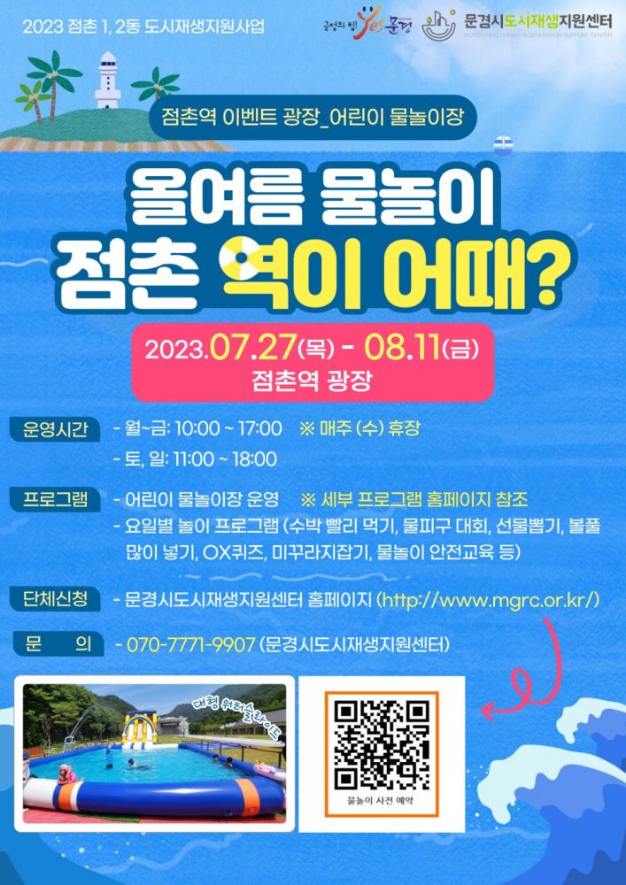 문경시도시재생지원센터는 여름방학을 맞아 7월 27일(목)부터 8월 11일(금) 2주간 점촌역 광장에서 원도심 속 어린이들에게 물놀이 체험 기회를 제공하고자 『점촌역이 어때?』를 개최할 예정이다.