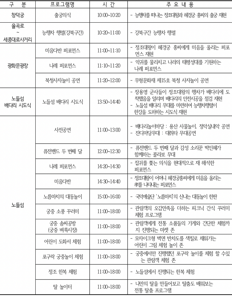 또한 광화문광장, 행궁광장, 융릉 등 주요 거점별로도 다양한 체험 프로그램을 마련해 풍성한 즐길 거리를 제공한다.