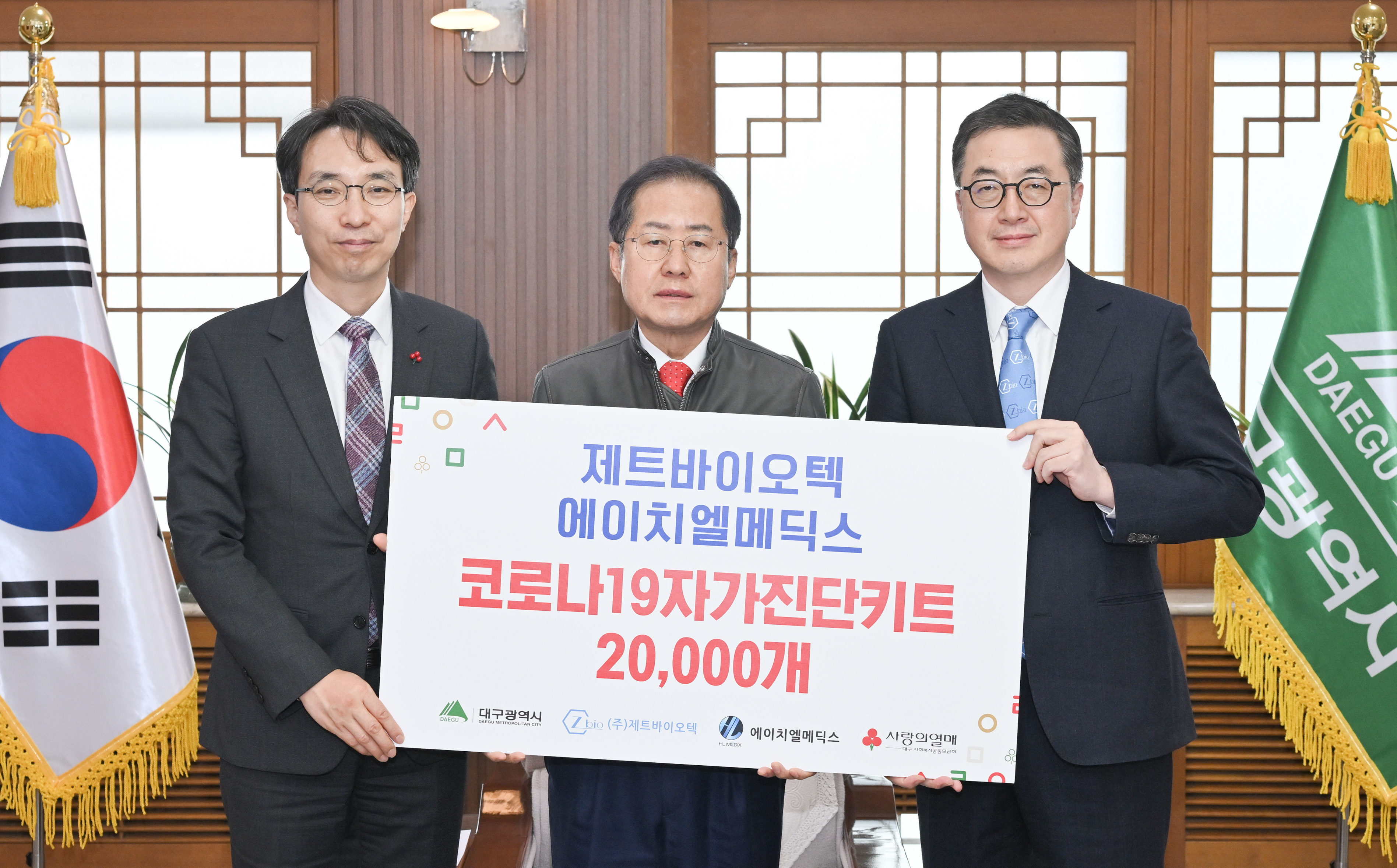 제트바이오텍과 에이치엘메딕스는 15일(수) 대구시청에서 홍준표 대구시장, 제트바이오텍 이석제 대표, 에이치엘메딕스 이윤환 대표, 대구사회복지공동모금회 김누리 사무처장 및 관계자들이 참석한 가운데 자가진단키트 20,000개를 대구사회복지공동모금회에 전달했다.