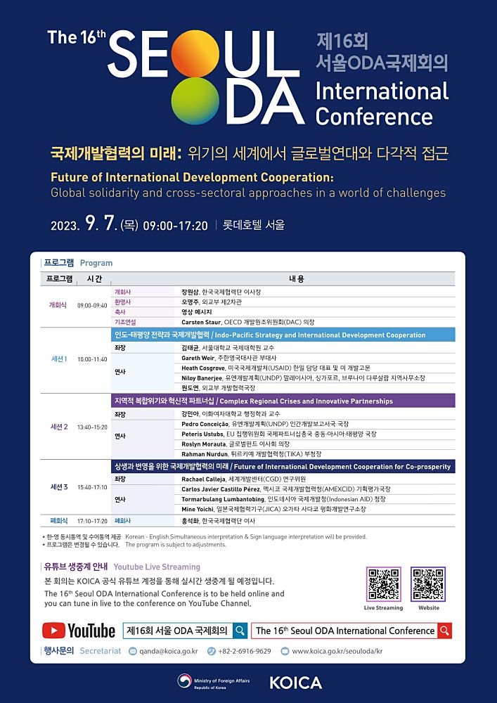외교부와 한국국제협력단(KOICA)은 「제16회 서울 ODA* 국제회의」를 9월 7일 개최할 예정이며, 미국, 일본, 튀르키예 등의 개발전담기관, 국제기구, 학계, 주한 외교단 등 주요인사들이 참석할 계획이다.