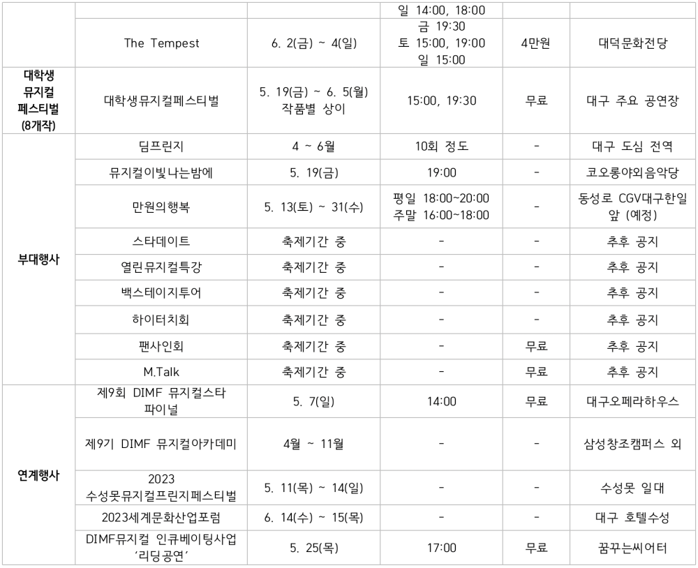 화창한 봄날씨와 함께 한달 앞당겨 개최되는 제17회 DIMF는 도심 곳곳에서 축제 분위기를 풍성히 만끽할 수 있도록 뮤지컬 공연과 함께 공연장 안팎으로 열리는 행사를 풍성하게 마련했다.