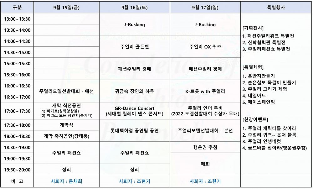 특히 전년도 모델수상자들의 축하공연인 ‘주얼리 인더 무비’와 대한민국 귀금속 명장인 ‘박정열 장인’이 직접 시민과 소통하는 시간인 ‘귀금속 장인의 하루’라는 프로그램을 마련해 체험의 즐거움과 함께 풍부한 볼거리를 제공한다.