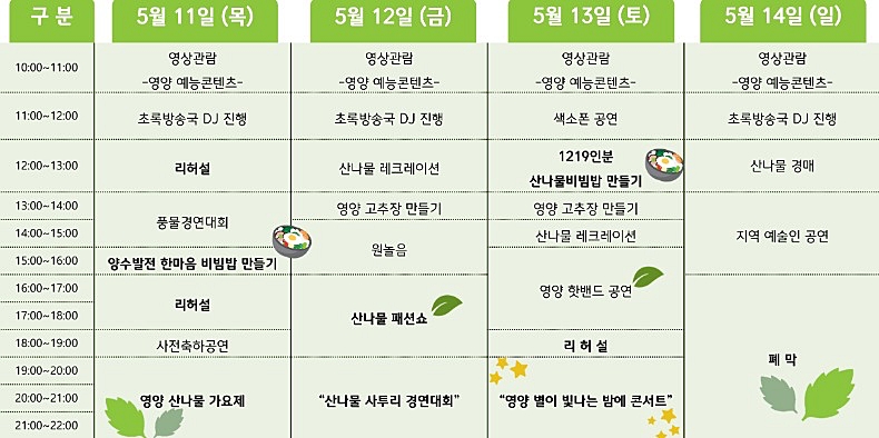 제18회 영양산나물축제가 5월 11일(목)부터 5월 14일(일)까지 4일간 영양군청, 영양전통시장, 일월산 일원에서 개최된다.