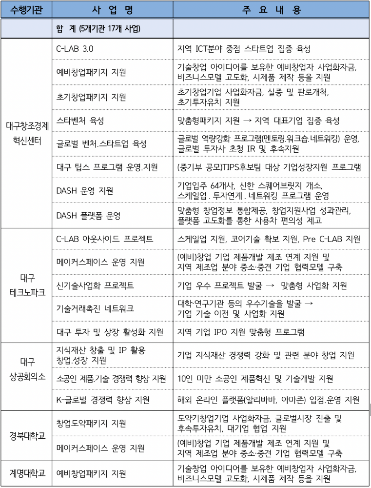 이를 위해 대구창조경제혁신센터, 대구테크노파크를 거점으로 ❶지역 우수 스타트업 육성 지원 확대 ❷성장 단계별 맞춤형 창업패키지 운영 ❸지역중심 투자펀드 조성으로 창업기업 투자 생태계 활성화 ❹대구스케일업허브(DASH)를 통한 전주기 창업정보 제공 ❺창업문화 확산을 위한 스타트업 축제 개최 등을 중점적으로 추진할 예정이다.