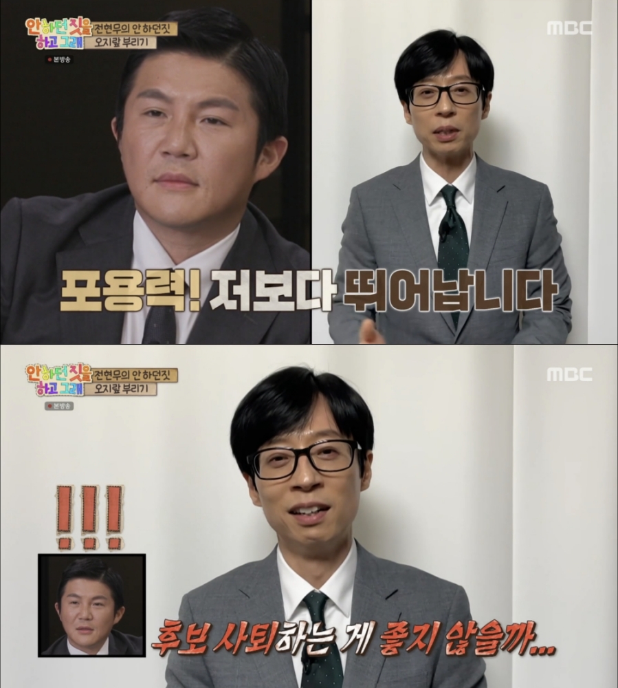 조세호의 ‘안하던 짓을 하고 그래’ 메인 MC 출사표에 유재석은 지지 영상을 통해 “조세호 씨는 재치가 뛰어나고 기본적으로 개그감이 장착돼 있으며 사람과 어우러짐, 포용력은 나보다 더 뛰어나다”며 “하지만 아쉽게도 스스로 노력해야 하는 부분은 진행이다. 여기서는 사퇴하는 게 좋지 않을까 싶다”고 말해 웃음을 선사했다. 지지 영상이 아니라 GG(포기) 권유 영상이었던 것.
