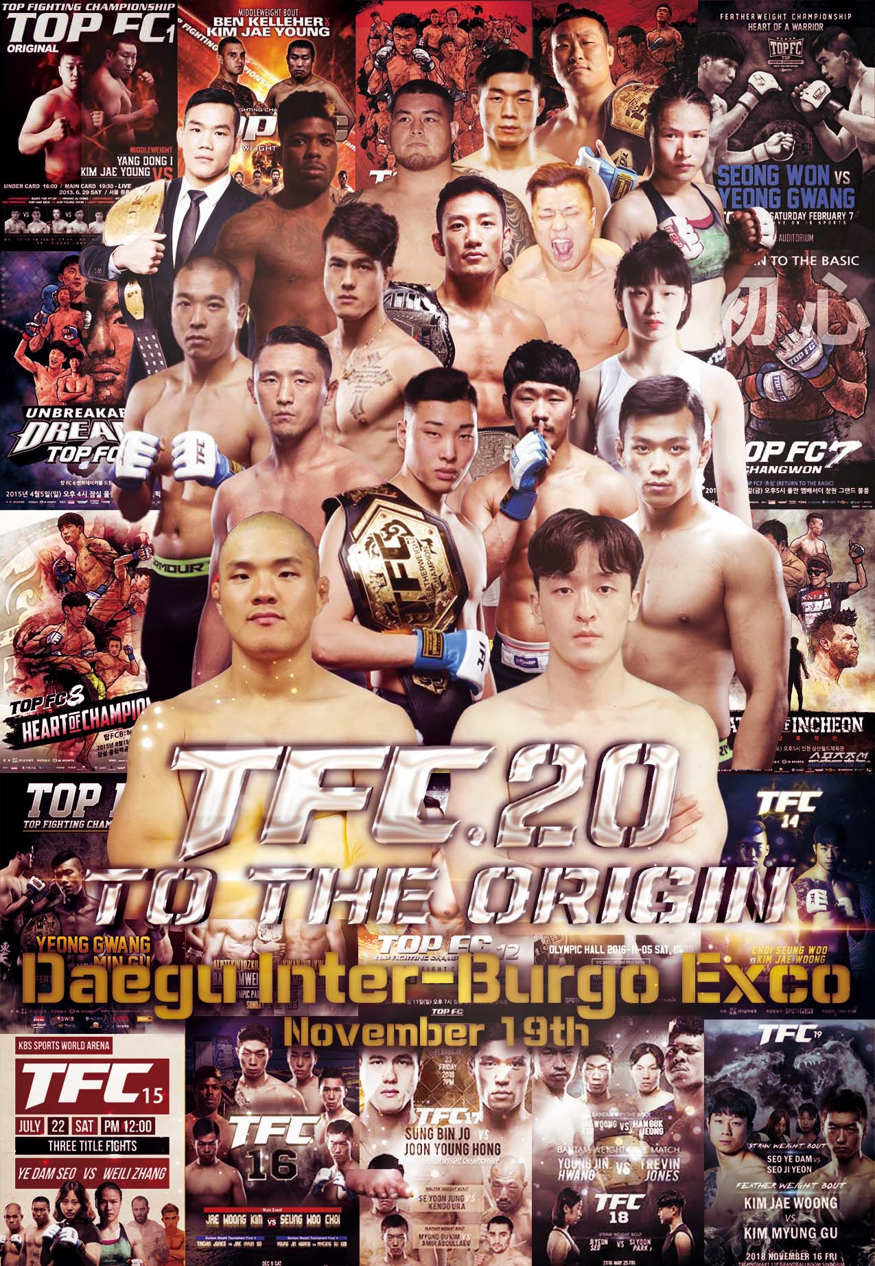 'To The Origin'이란 부제로 펼쳐지는 이번 대회의 메인이벤트는 베테랑 홍성찬(31, 코리아탑팀)과 특급 신예 최성혁(24, 팀한클럽)의 라이트급매치로 정해졌다. 홍성찬은 TFC 라이트급 최상위권에서 꾸준히 활약했던 올라운더로 전형적인 그라운드 앤 파운더이다. 킥복서 출신인 최성혁은 지난 7월 'TFC 드림7'을 통해 묵직한 인상을 남긴 바 있다.