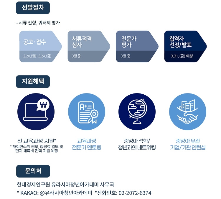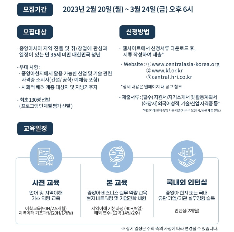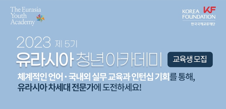 KF(Korea Foundation, 한국국제교류재단) 한-중앙아협력포럼사무국은 오는 2월 20일(월)부터 3월 24일(금)까지 제 5기 <2023 유라시아 청년 아카데미> 참가자를 모집한다.