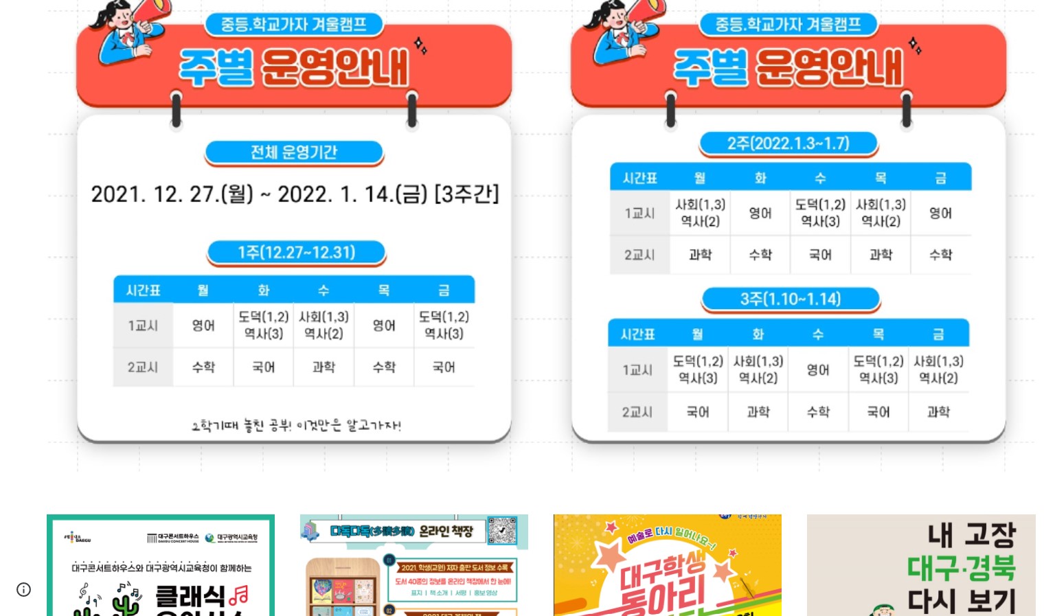 대구시교육청은 겨울방학 중 학생들의 기초·기본학력 향상과 자기주도학습능력 신장을 위해 12월 27일(월)부터 1월 21일(금)까지 4주간 ‘중등.학교가자.com_겨울캠프’를 운영한다.