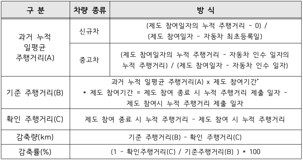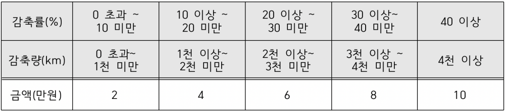 참여자는 활동 기간 동안 차량 운행거리를 감축하고 참여 종료 시 누적 주행 거리를 확인할 수 있는 차량 계기판 사진을 전송하면 감축률에 따라 인센티브가 지급되며, 참여 기간 중 기준 주행거리 대비 4천km 이상 또는 40% 이상 감축 시에는 최대 10만 원이 지급된다.