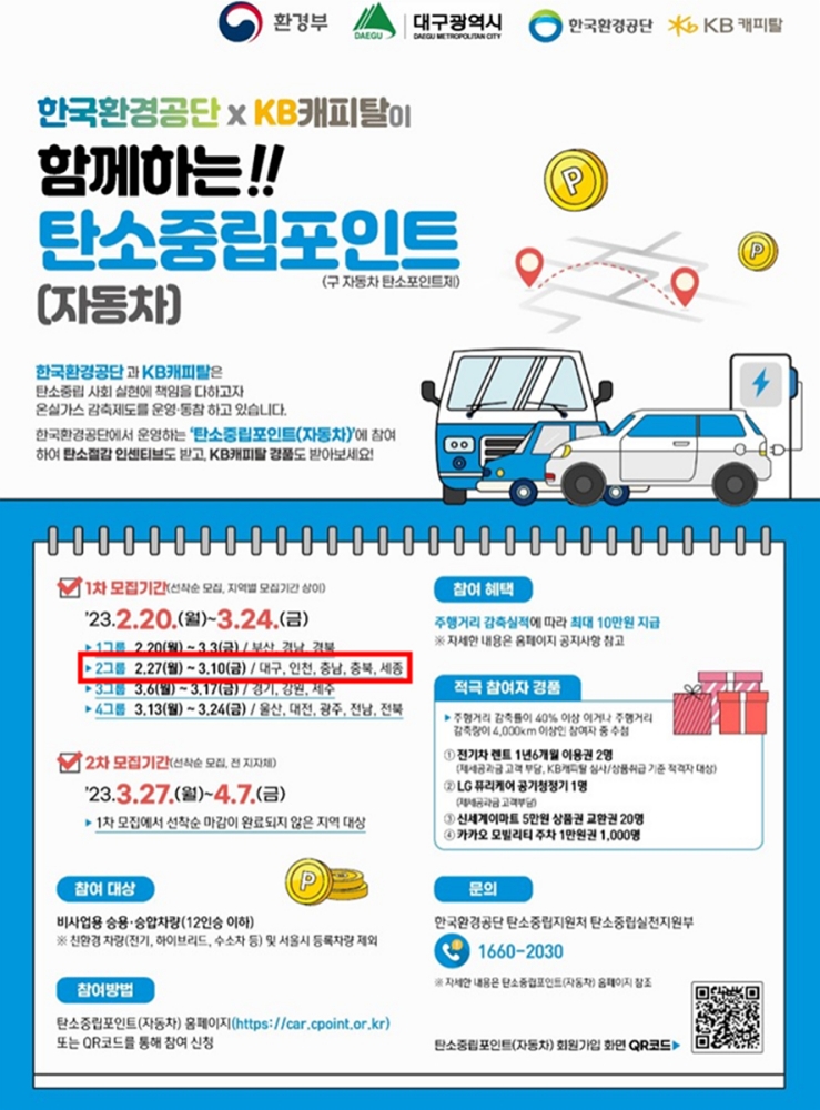 대구시는 사업 예산을 2022년보다 25% 증액한 2억 4천만 원을 마련해 훨씬 많은 시민이 자동차 탄소중립포인트제 참여 인센티브를 받을 수 있게 된다.