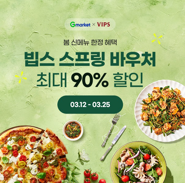 G마켓과 옥션이 12일부터 25일까지 2주간 ‘빕스 1만5000원 스프링 바우처’를 1500원에 선보인다. 외식 수요가 증가하는 봄 시즌을 맞아 G마켓, 옥션 단독으로 특가 판매한다.