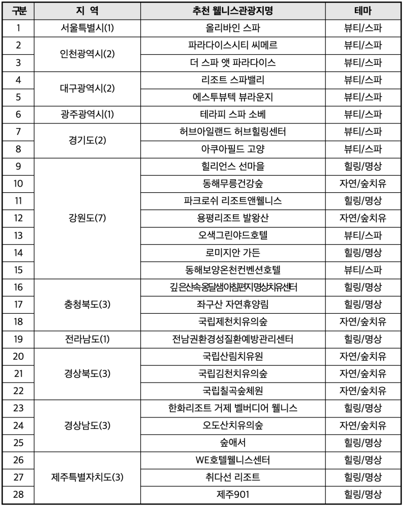 이번 지원사업은 참가자들이 여전히 현장에서 종사하고 있는 점을 고려해 전국 28개소*에서 다양한 일정(당일, 1박 2일, 2박 3일)에 참여할 수 있도록 준비했다. 참가자들은 선택한 일정에 따라 ‘추천 웰니스 관광지’에서 숲 체험, 치유 요가, 다도, 명상, 건강 식단 등을 체험할 수 있다.
