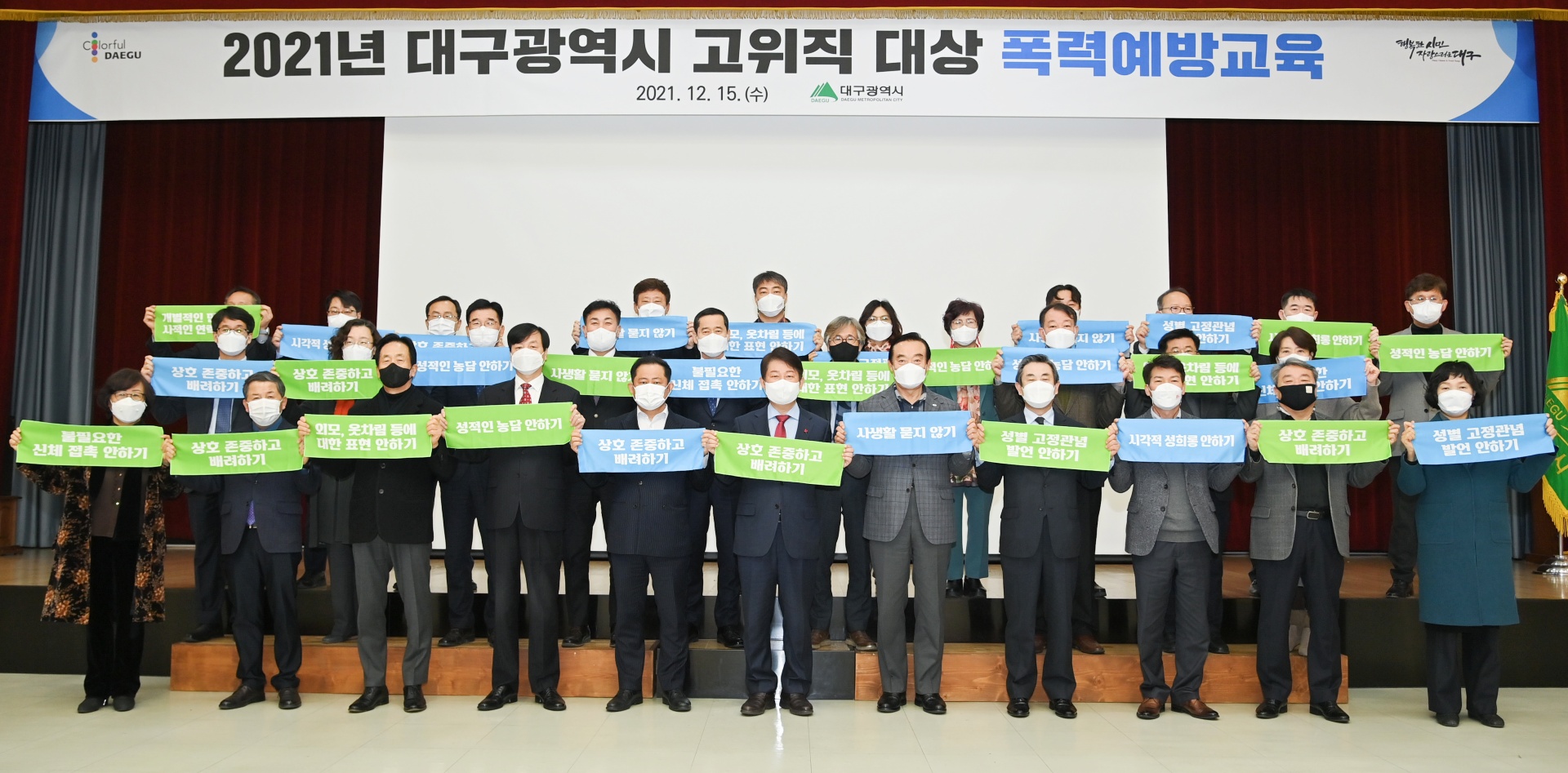 대구시는 12월 15일(수) 오전 9시 30분 시청별관 대강당에서 권영진 대구시장, 3급 이상 고위직 간부 공무원, 공직유관단체장 등 50여 명이 참석한 가운데, 폭력예방교육 전문강사를 초빙해 직장 내 폭력예방 특별교육을 실시하고 직장 내 성희롱·성폭력 예방을 위한 8가지 수칙 실천결의를 다졌다.