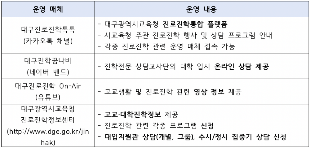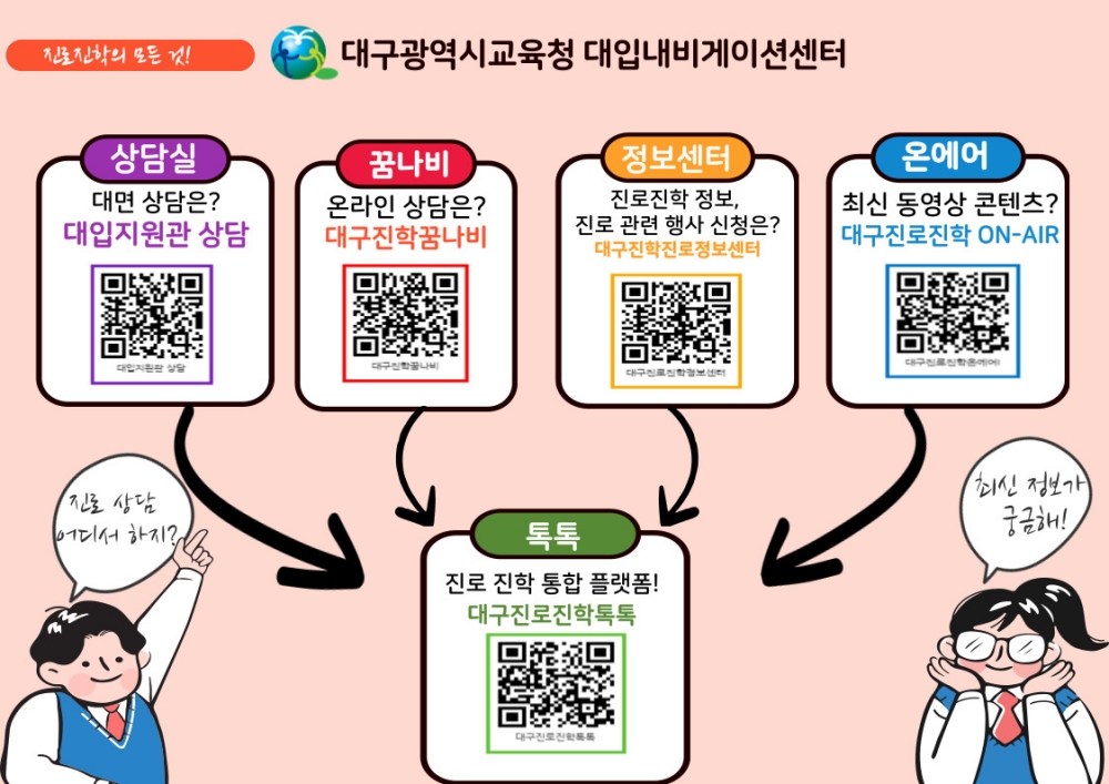 그동안 진로진학 및 상담 정보 등을 활용하려면 대구진학꿈나비(네이버밴드), 대구진로진학 On-Air(유튜브), 진로진학정보센터(누리집) 등 각각의 매체를 직접 찾아야 했지만, 진로진학 통합 플랫폼‘대구진로진학톡톡’을 이용하면 대구시교육청에서 운영하는 진로진학 및 상담 정보를 제공하는 다양한 매체로 바로 접속이 가능하다.