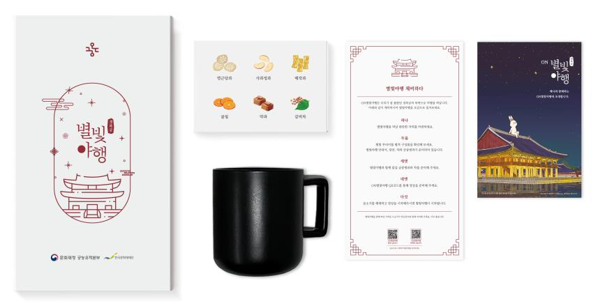 이번에 진행되는 ‘궁온’ 프로그램에서는 ‘온(ON) 별빛야행’을 주제로 밤의 경복궁 정취를 영상으로 보며 다과를 즐길 수 있는 체험 꾸러미(키트)가 제공된다. 궁중병과 5종(연근당과⸱사과정과⸱매작과⸱약과⸱귤칩)과 약차 1종(감비차), 향기 나는 별빛카드와 손잡이가 달린 잔(머그잔)으로 구성했다. 토끼 캐릭터 ‘베니’로 유명한 구경선 작가와 협업하여 제작한 카드에는 베니가 경복궁, 창덕궁, 조선왕릉을 방문한 삽화가 그려져 있고, 향기도 첨가돼 있어 궁궐의 아름다움을 오감으로 즐길 수 있는 기회가 될 것이다.