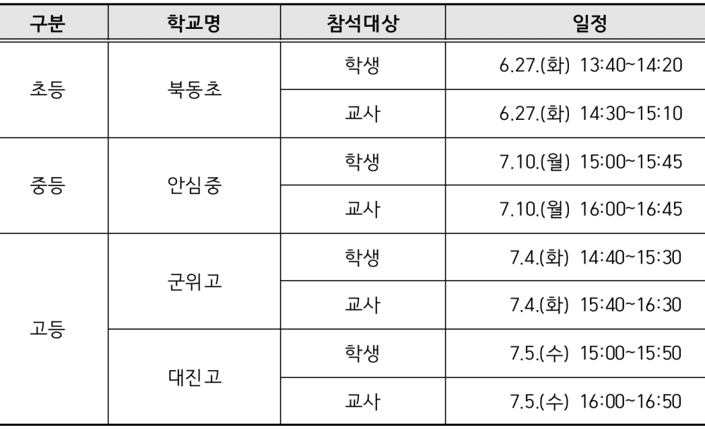 대구시교육청은 대구교육 정책과 현안에 대한 다양하고 균형 있는 의견을 수렴하고 실질적인 개선방안을 모색하고자 학교급별ㆍ지역별로 구분하여 대상학교 4교*를 선정했다.