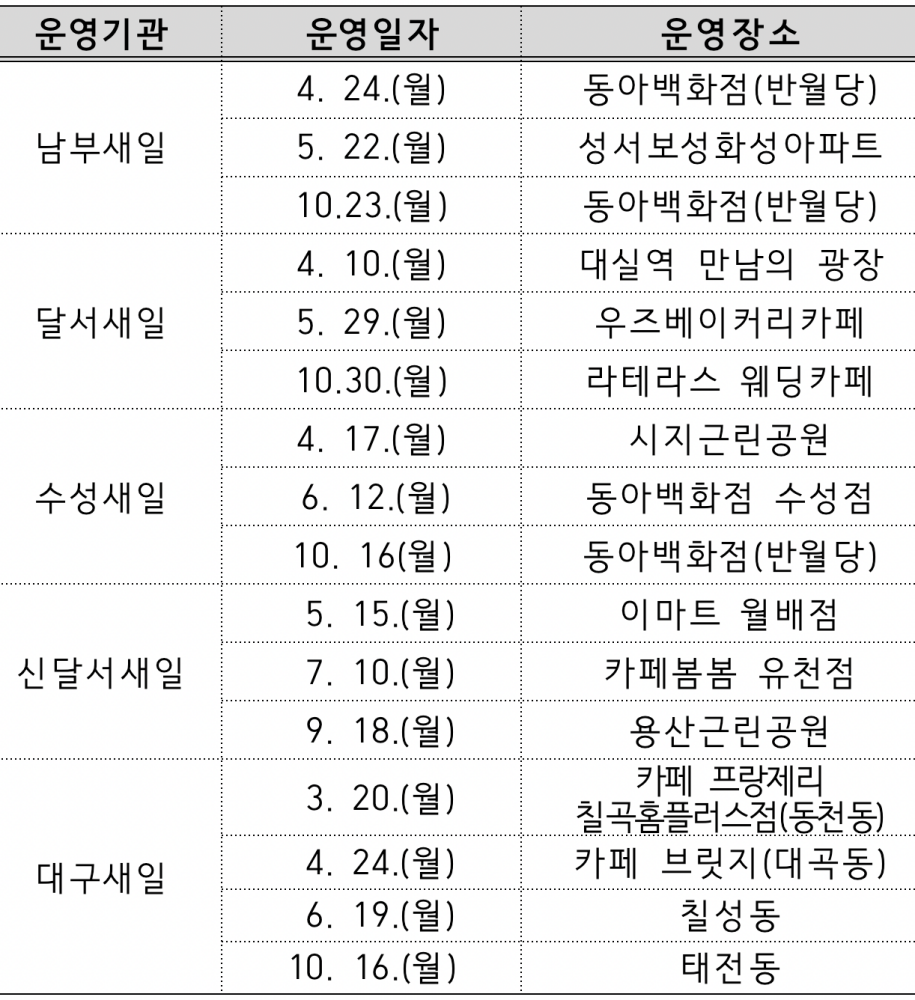 찾아가는 여성일자리 굿잡(Good Job) 버스&카페’는 2016년부터 시작하여 총 100회 운영, 현장면접(간접채용 포함)2,064명 중에 1,425명이 취업에 성공했다. 올해 첫 행사는 북구 프랑제리 카페(칠곡 홈플러스점)에서 진행되며, 대구여성새로일하기센터에서 주관하고 여성친화 직종으로 분류된 8개 기업체가 참여하여 32명의 여성을 채용할 예정이다.