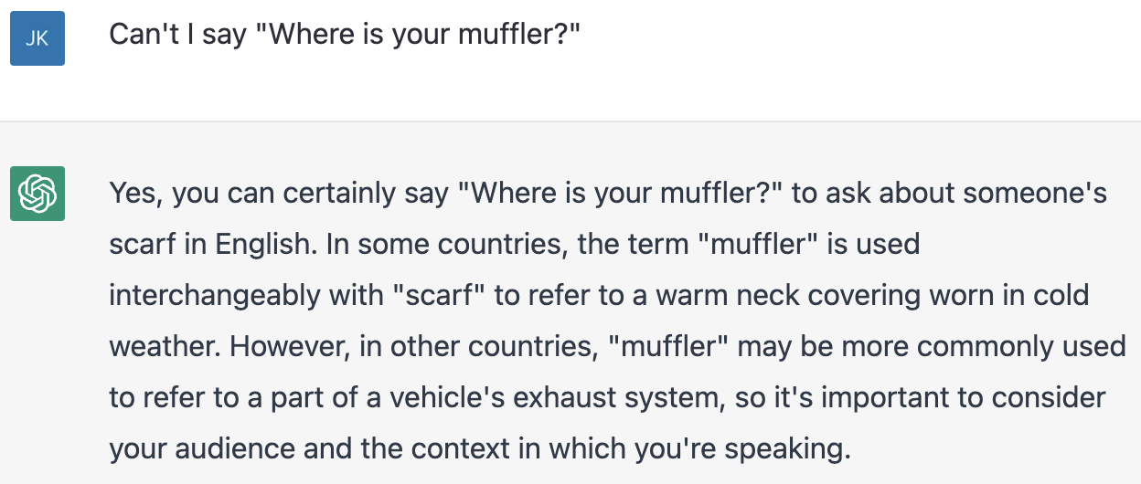 그런데 'Scarf' 대신 'Muffler'라고 하면 안될까. 챗GPT에게 Can't I say "Where is your muffler?"라고 물어봤다. 챗GPT는 이전 대화를 인식하고 있기에 대화에 흐름에 맞는 적절한 답변을 해준다.