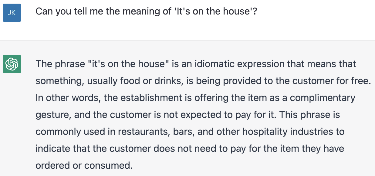 'It's on the house'의 의미를 물어보니 관용적 표현으로 '무료'를 뜻하는 문장이라고 알려준다.