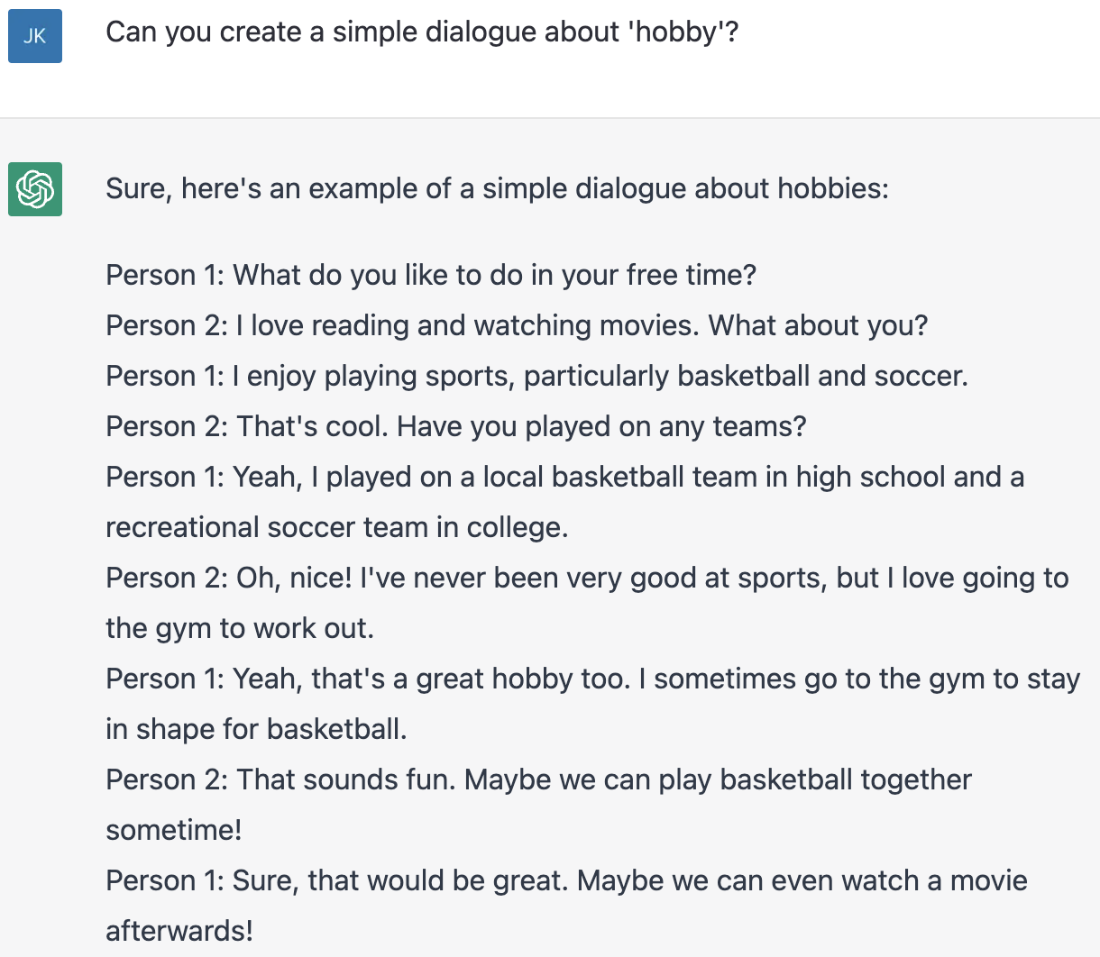 특정 주제에 관한 대화를 만들어 달라고도 할 수 있다. 이럴 때는 Can you create a simple dialogue about '~'? 라고 하면 된다. '취미'에 관한 대화를 만들어 달라고 했다.