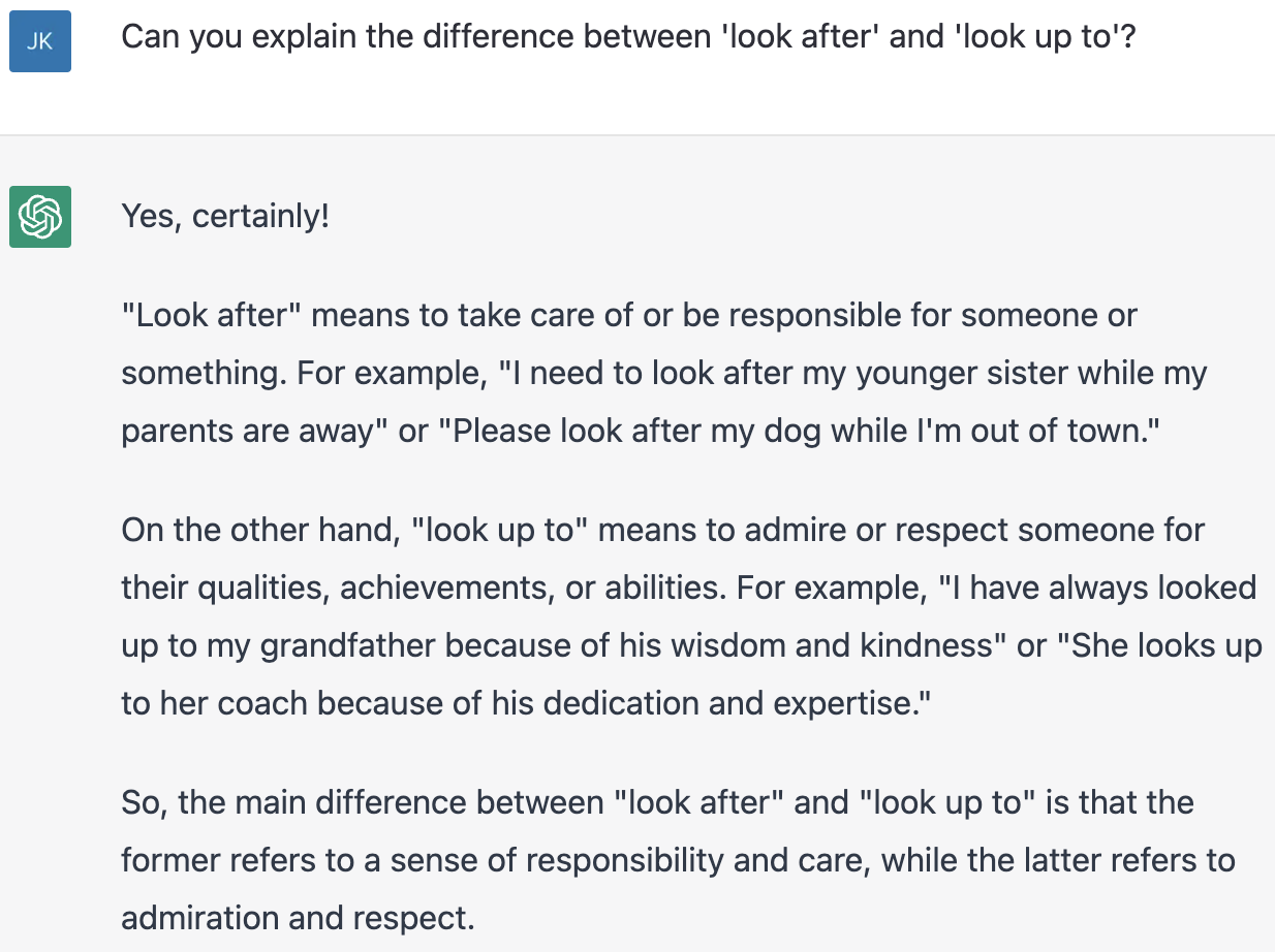 비슷한 표현의 차이점을 알고 싶을 때는 Can you explain the difference between '~' and '~'? 라고 물어보면 된다. 같은 'look'이라는 단어가 들어간 'look after'와 'look up to'의 차이점에 대해 물어봤다.