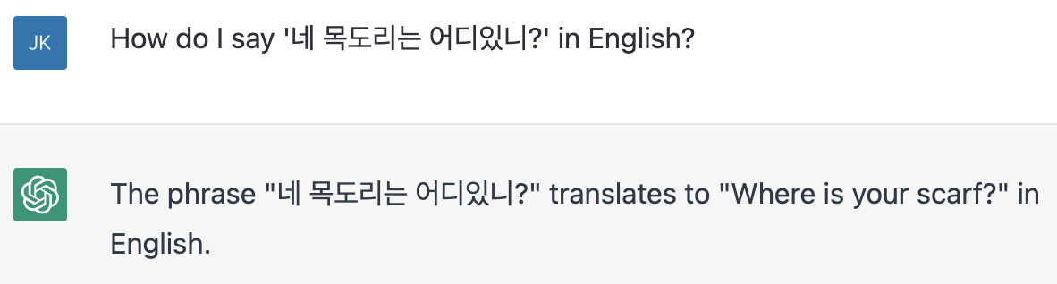 만약 '네 목도리는 어디있니?'라는 문장이 영어 표현으로는 어떻게 되는지 알고 싶다면 챗GPT 프롬프트에 How do I say '네 목도리는 어디있니?' in English? 라고 입력하면 된다.