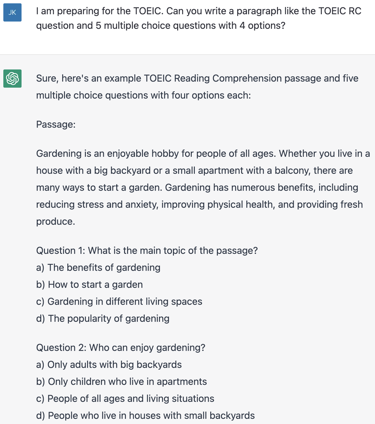 토익 RC(Reading Comprehension) 예제가 필요하다면 챗GPT에게 부탁하자. I am preparing for the TOEIC. Can you write a paragraph like the TOEIC RC question and 5 multiple choice questions with 4 options? 독해 예제를 만들고 4개의 선택지가 있는 질문 5개를 만들어 달라고 했다.