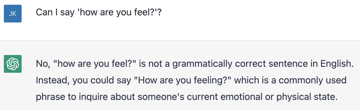 'How are you feel?'이 맞는 표현인지 물어보니 잘못된 표현이라며 친절하게 대신 'How are you feeling?'을 사용하라고 알려준다.
