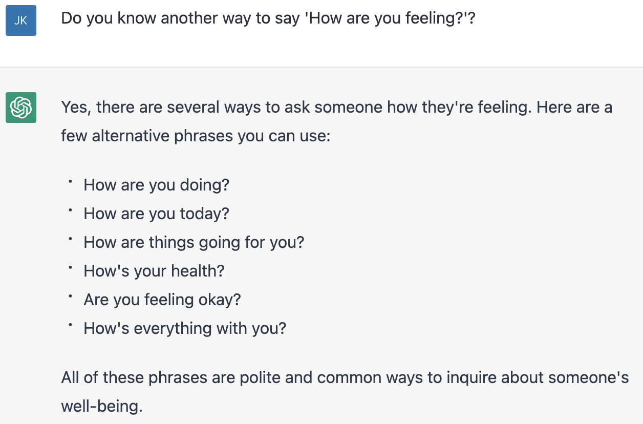'How are you feeling?'을 대신해 사용할 수 있는 표현을 물어보니 'How are you today?', 'How are you doing?' 등 다양한 표현을 알려준다.