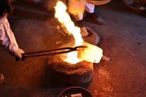 | 가열한 놋쇠의 강약 질을 잡아 경도를 높여주기 위한 작업으로 달구어진 우개리를 빠른 속도로 찬물에 넣어 금속의 인내성을 잡아주는 담금질 | 담금질한 기물은 찬물에 넣는 순간 형태가 일그러지게 되는데 이때 원래의 형태대로 잡아주는 작업인 벼름질 | 완성된 기물의 산화피막을 제거하고 망치자국을 없애 놋쇠의 광이 나게끔 하는 과정인 가질 |