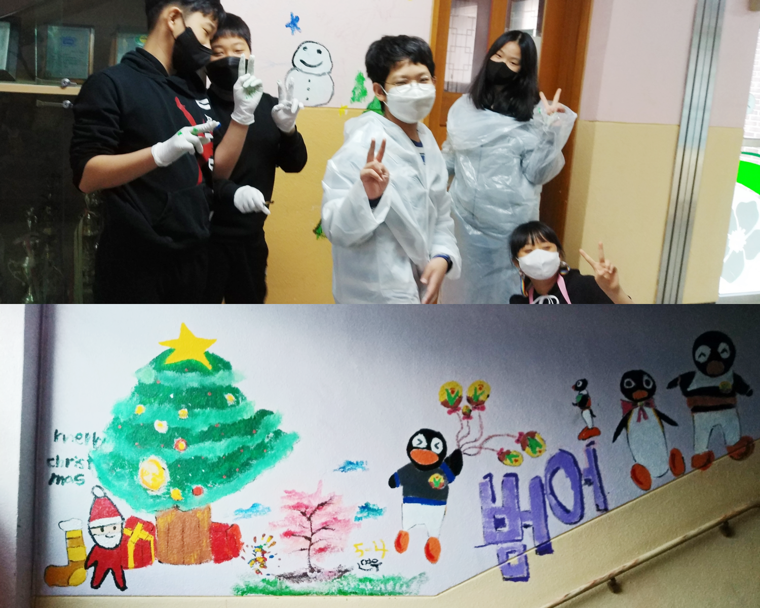 곧 허물어질 학교 건물을 아쉬워한 5학년 학급회의에서 제안된 학생들의 아이디어로 5학년 5개 학급 학생들이 12월 13일(월)부터 12월 20일(월)까지 건물 내·외벽에 벽화를 그리기로 한 것이다.
